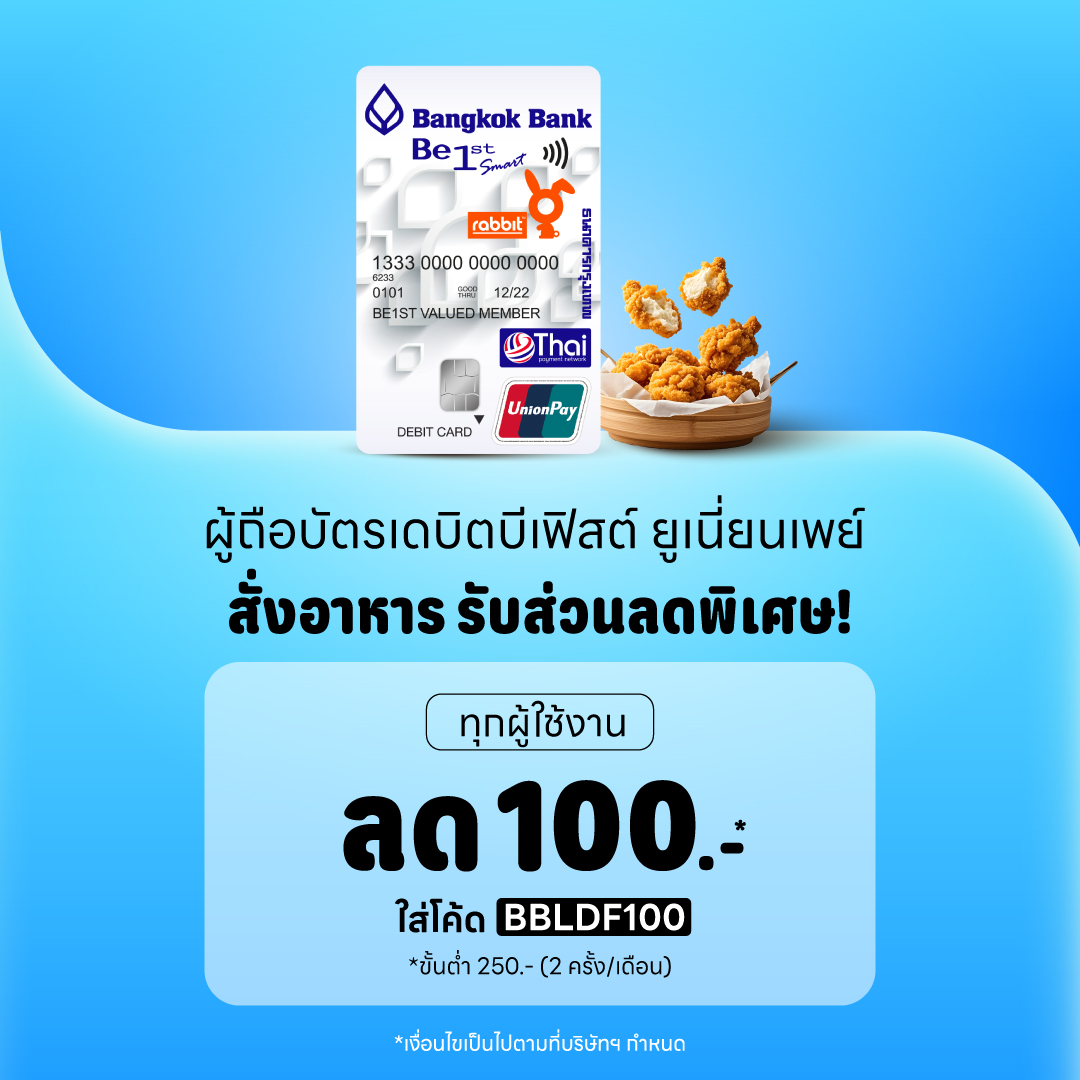 - ใส่โค้ด BBLDF100 รับส่วนลดค่าอาหาร 100 บาท