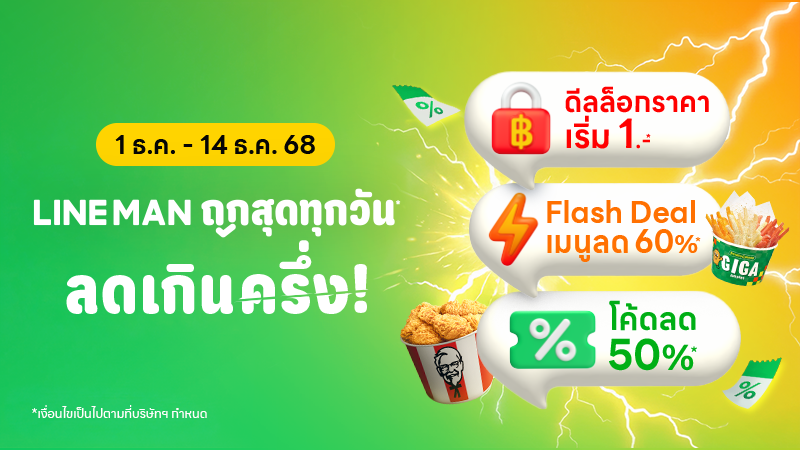 ระยะเวลาของกิจกรรม : กิจกรรมจัดขึ้นระหว่างวันที่ 1 ธันวาคม 2568 – 14 ธันวาคม 2568 (หรือจนกว่าจำนวนสิทธิ์จะหมด ทั้งนี้ LINE MAN อาจเปลี่ยนแปลงระยะเวลาตามที่เห็นสมควร)