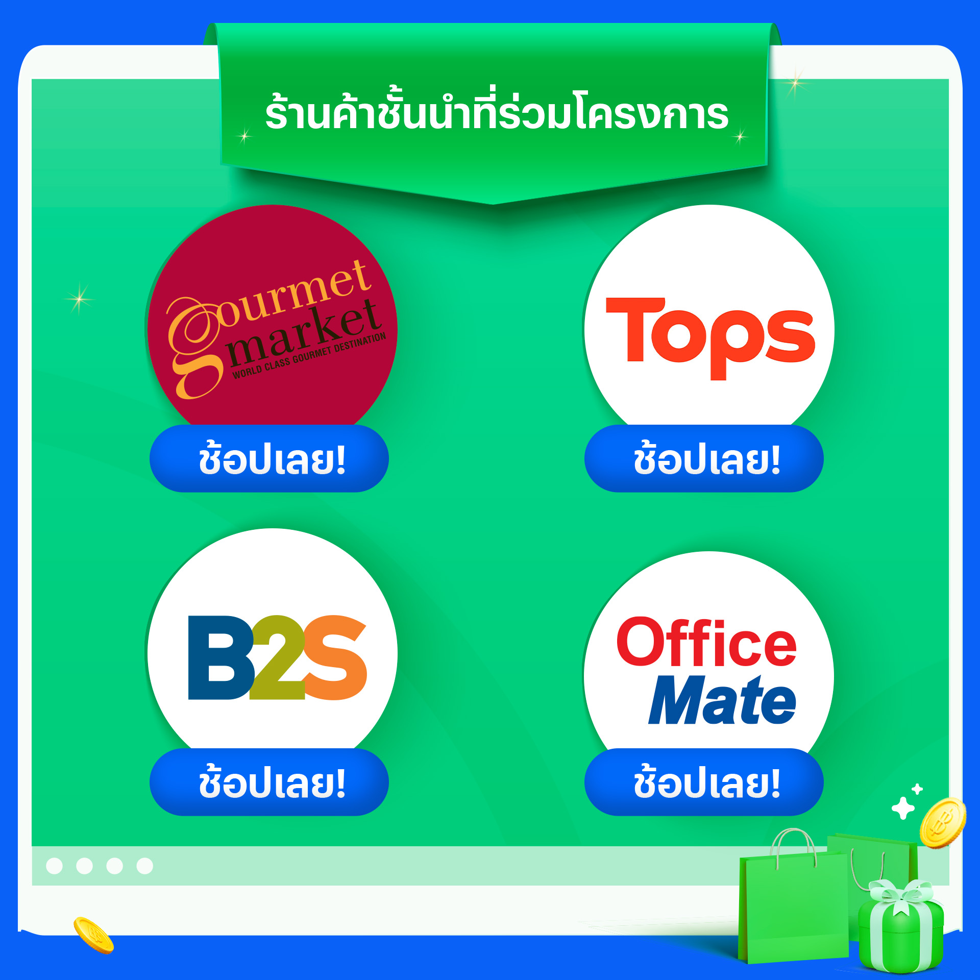 • มีร้านค้าชั้นนำมากมายที่ร่วมโครงการ ไม่ว่าจะเป็น Tops, Gourmet Market, B2S และ OfficeMate