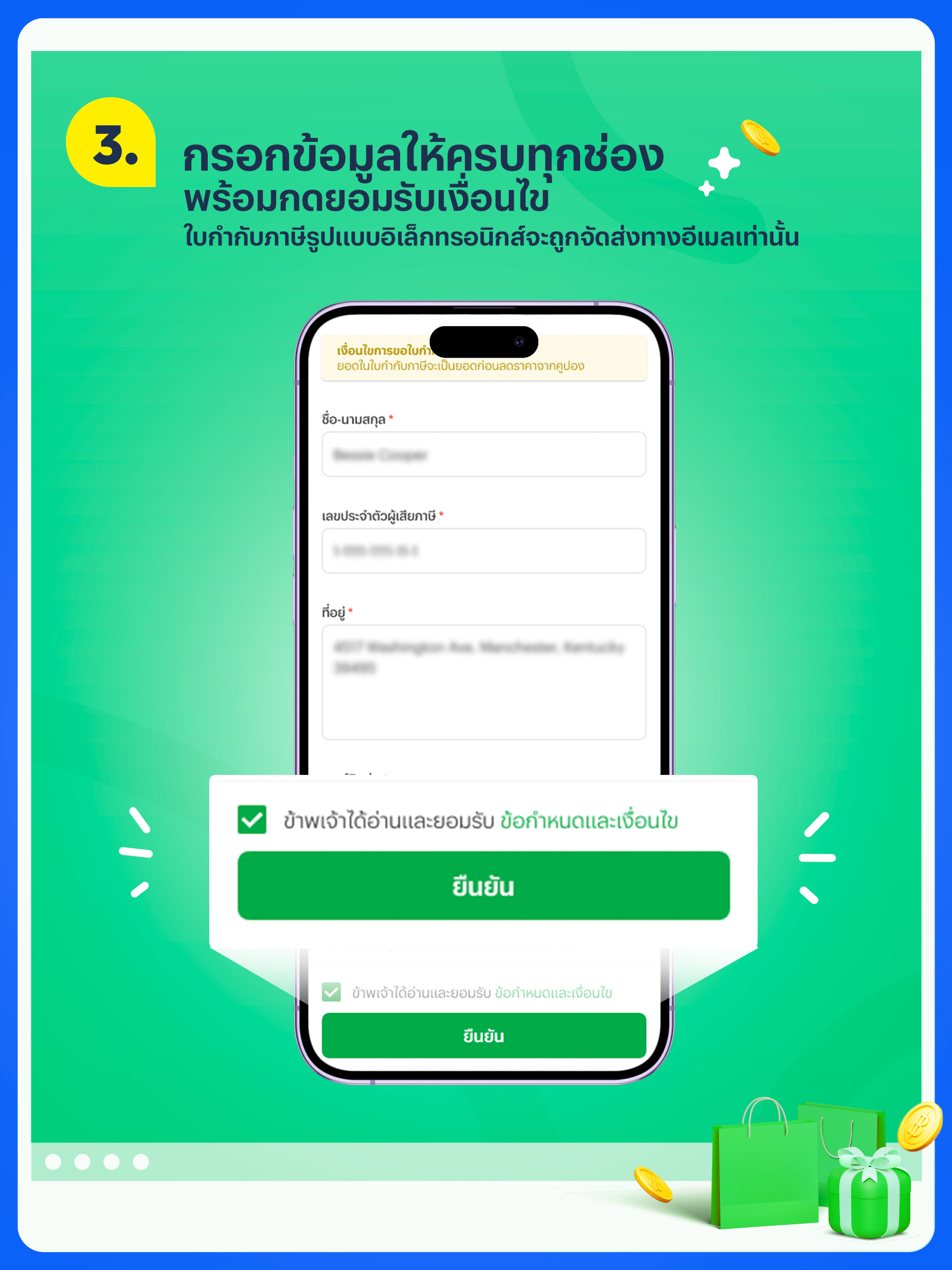 • ขอได้ง่าย ๆ ไม่ต้องออกจากบ้าน ไม่ต้องเหนื่อยรอเข้าคิวขอใบกำกับภาษีมูลค่าเพิ่มเต็มรูปแบบเอง สะดวก ประหยัดเวลา เพียงแค่รอรับใบกำกับภาษีเต็มรูปแบบในรูปแบบเล็กทรอนิกส์ทางอีเมลที่แจ้งไว้ใน 7 วันทำการ