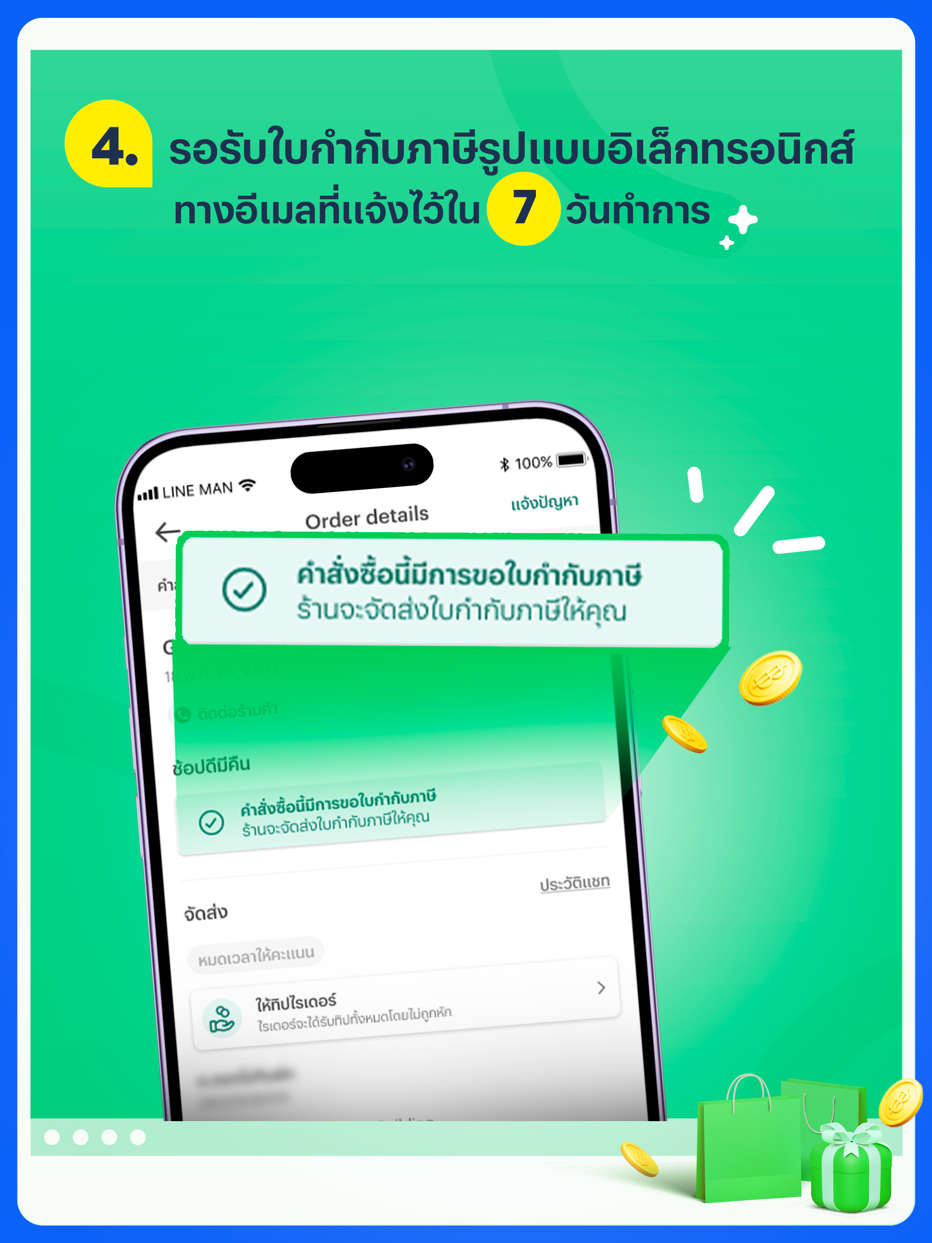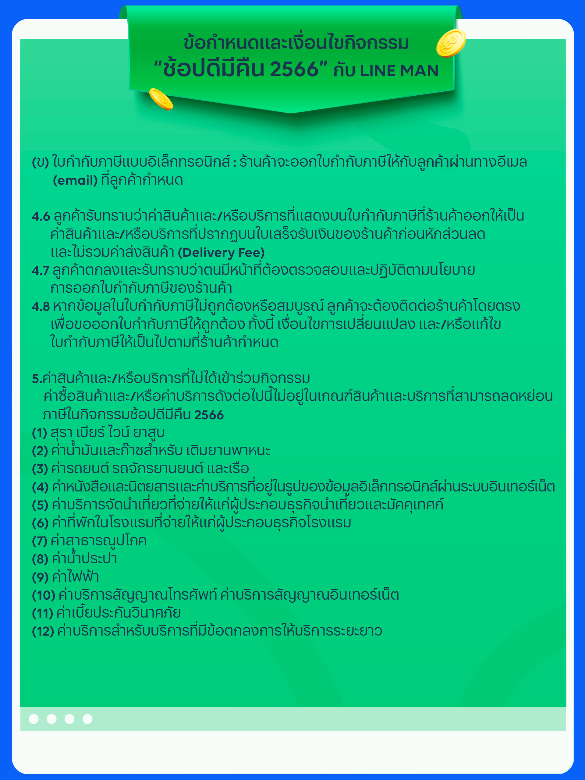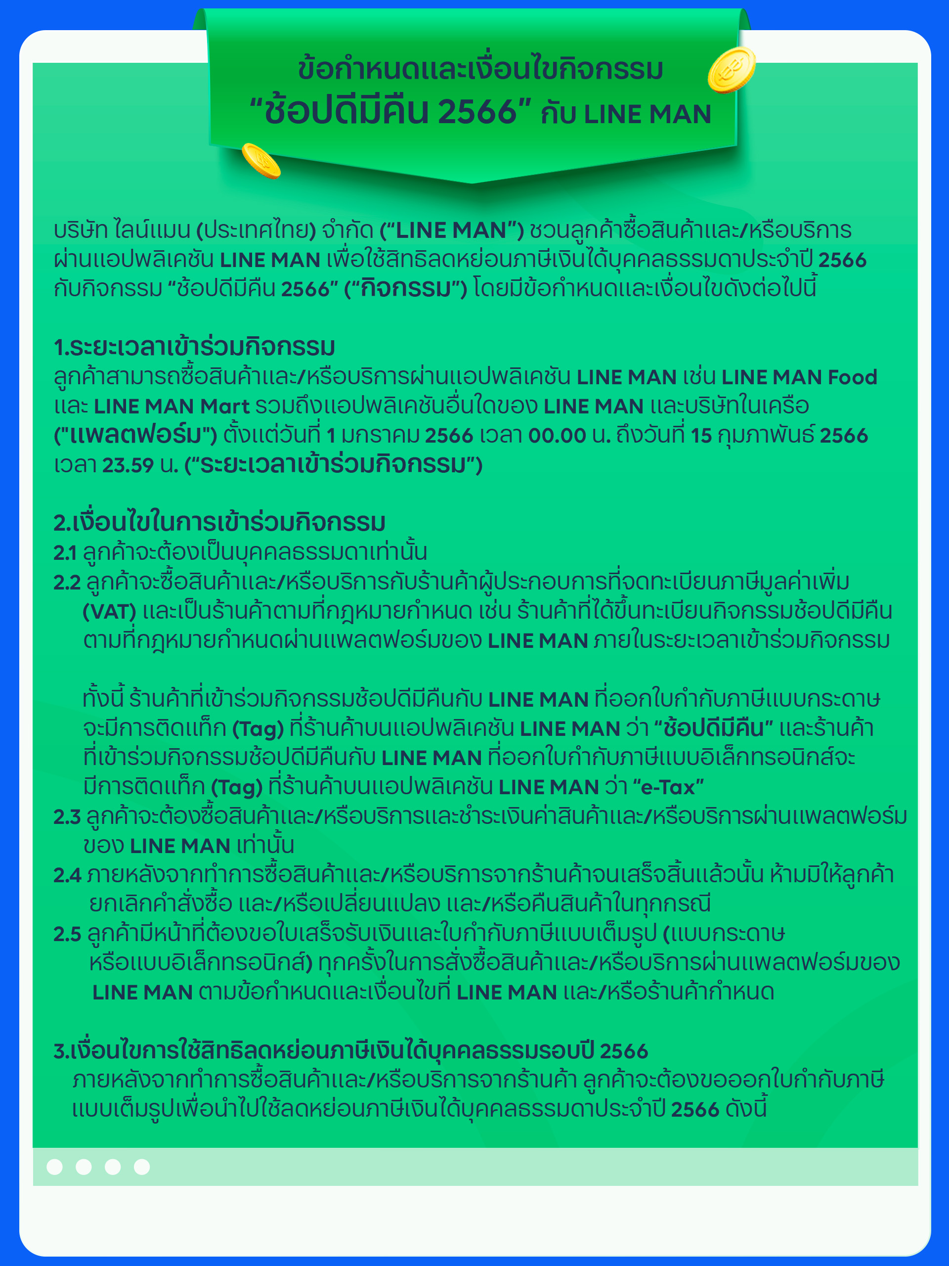 • หากท่านซื้อสินค้าและบริการจากร้านค้าบน LINE MAN MART ที่มีการติดแท็ก ช้อปดีมีคืน และ E-Tax ท่านจะได้รับใบกำกับภาษีเต็มรูปแบบในรูปแบบเล็กทรอนิกส์ ซึ่งสามารถใช้ลดหย่อนภาษีสูงสุดได้ถึง 40,000 บาท หากเป็นใบกำกับภาษีเต็มรูปแบบในรูปแบบกระดาษ จะสามารถใช้ลดหย่อนภาษีสูงสุดได้แค่ 30,000 บาท เท่านั้น