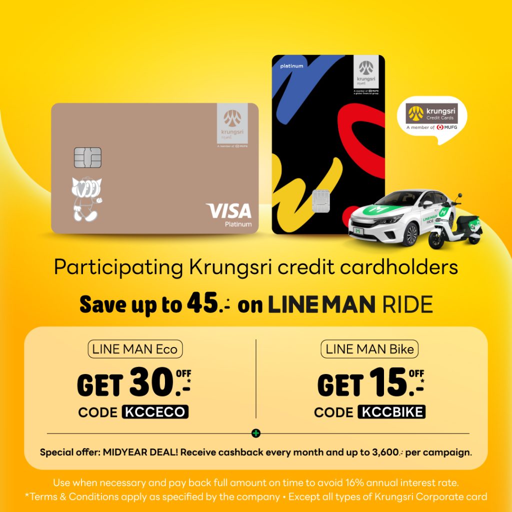 - Payment must be made with participating Krungsri credit card *excluding all types of Krungsri Corporate Cards for the first time on the LINE MAN application.