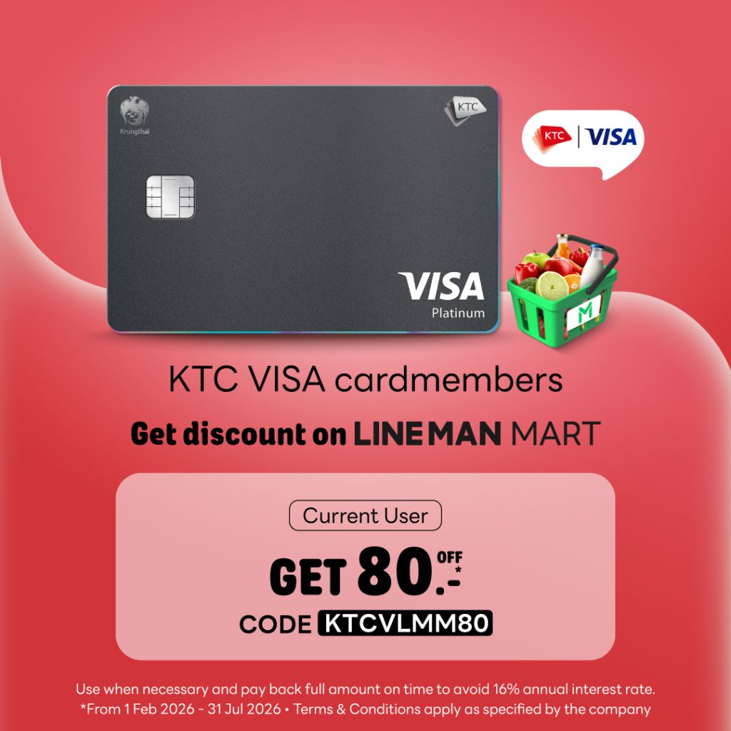 - This promotional campaign (“Promotion”) is provided by Krungthai Card Public Company Limited or KTC to offer the exclusive privileges to members of KTC VISA credit card (“Cardmember(s)”) who spend on card at LINE MAN on February 1st, 2026 – July 31st , 2026 (“Promotion Period”) according to specified terms and conditions only.