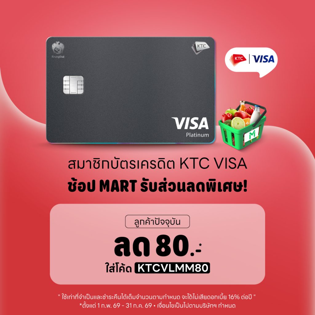 - รายการส่งเสริมการขาย (“รายการ”) นี้ บริษัท บัตรกรุงไทย จำกัด (มหาชน) หรือ เคทีซี จัดทำขึ้นเพื่อมอบสิทธิประโยชน์ให้แก่สมาชิกบัตรเครดิต KTC VISA (“สมาชิก”) ที่ใช้จ่ายผ่านบัตรฯ ณ ร้านค้าที่ร่วมรายการ ในช่วงระหว่างวันที่ 1 ก.พ. 69 – 31 ก.ค. 69 (“ระยะเวลารายการ”) ตามเงื่อนไขที่กำหนดเท่านั้น