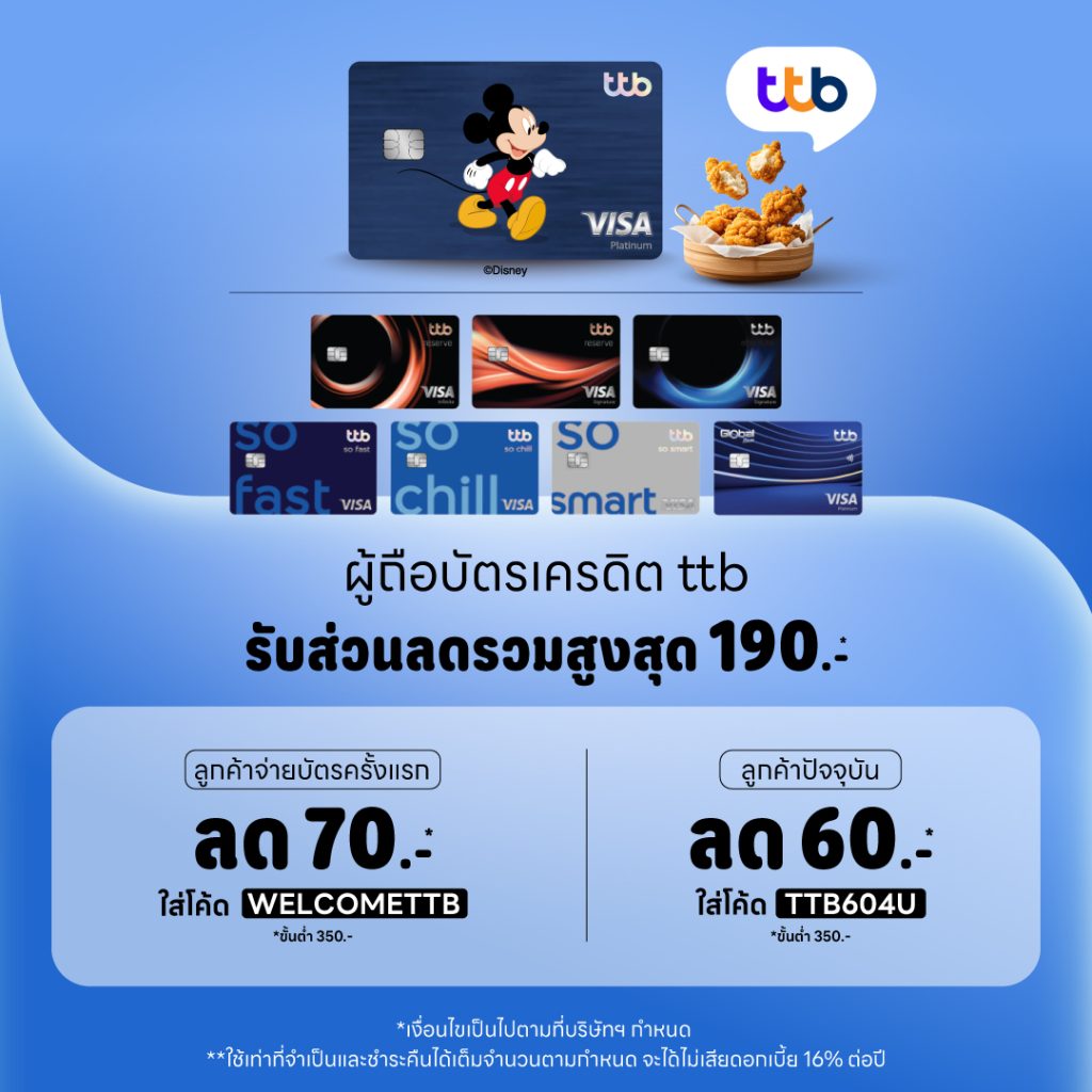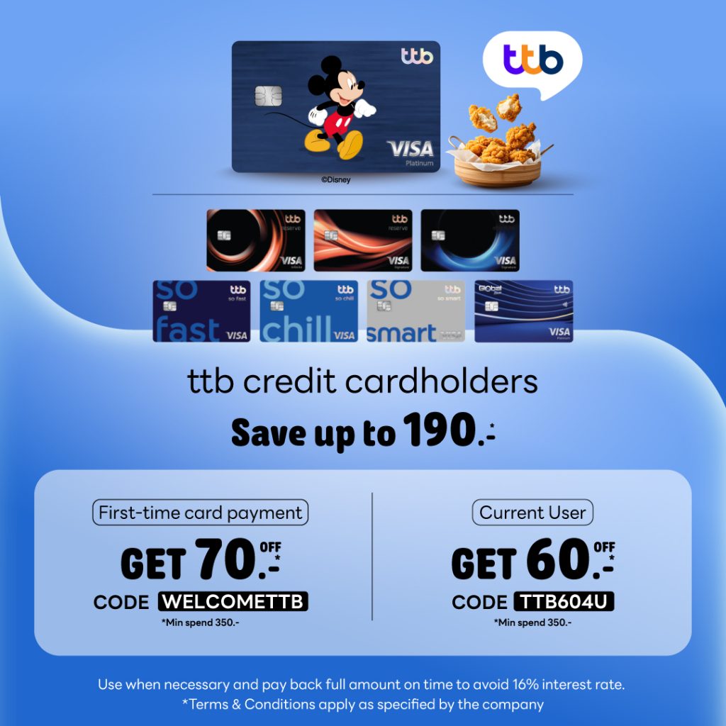 - Payment must be made with a ttb credit card (TMB Credit Card, Thanachart Credit Card) for personal use only. Corporate credit cards of any type are excluded.