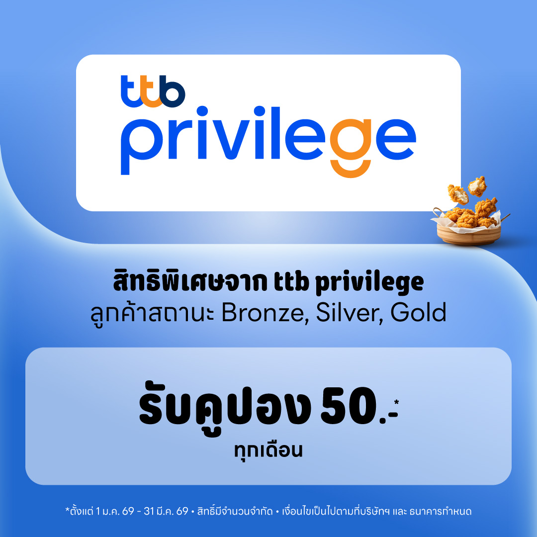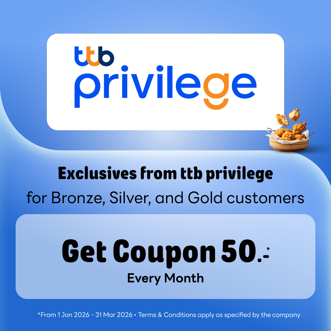 - ลูกค้า ttb privilege สถานะ Bronze , Silver และ Gold รับฟรี คูปอง LINEMAN มูลค่า 50 บาท ทุกเดือน